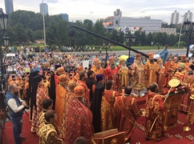 Затем паломников доставили в то самое место, где была убита Царская семья, место, где ныне находится величественный Храм-на-Крови. Именно здесь, под открытым небом в условиях непогоды совершалось всенощное бдение, а ровно в полночь началась Божественная литургия. Богослужения возглавил постоянный член Священного Синода, глава Среднеазиатского митрополичьего округа митрополит Ташкентский и Узбекистанский Викентий в сослужении митрополита Екатеринбургского и Верхотурского Кирилла, архиепископа Севастийского Феодосия (представителя Иерусалимской Патриархии), епископа Тарского и Тюкалинского Савватия и еще нескольких иерархов Русской Православной Церкви.