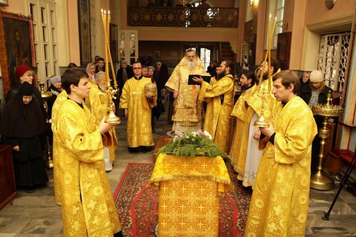 Его Высокопреосвященству сослужили: митрофорный протоиерей Михаил Котляров, протоиерей Сергий Алахтаев, протоиерей Сергий Николаев, иерей Игорь Лосев, иеродиакон Михаил (Столяров), диакон Феодор Бураков, иеродиакон Модест (Бузин), иеродиакон Даниил (Губайдулин).