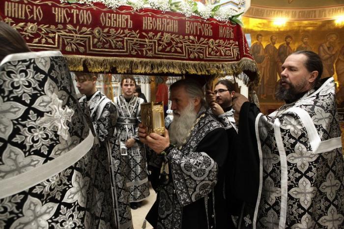 В конце вечерни, при пении тропаря «Благообразный Иосиф, с древа снем Пречистое Тело Твое», из алтаря на середину храма была перенесена Святая Плащаница с изображением погребения Христа.
