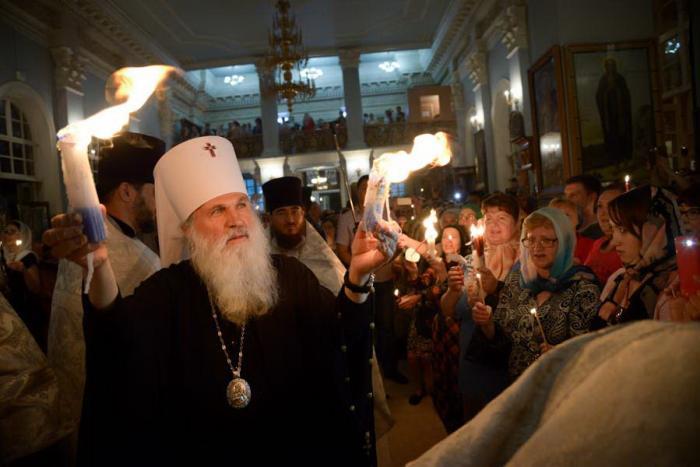 По завершении Пасхальной утрени владыка Викентий и священнослужители облачились в красные одеяния, символизирующие собой радость о воскресшем Господе.
