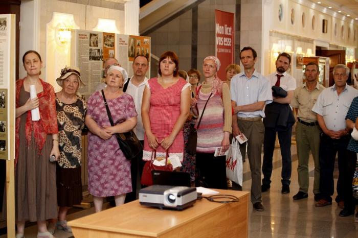 Затем был показан фильм с документальными кадрами хроники кампании по изъятию ценностей. Сотрудница музейно-выставочного отдела КПФ «Преображение» Ольга Борисовна Филиппова представила экспозицию гостям. Ее рассказ вызвал живой отклик гостей.