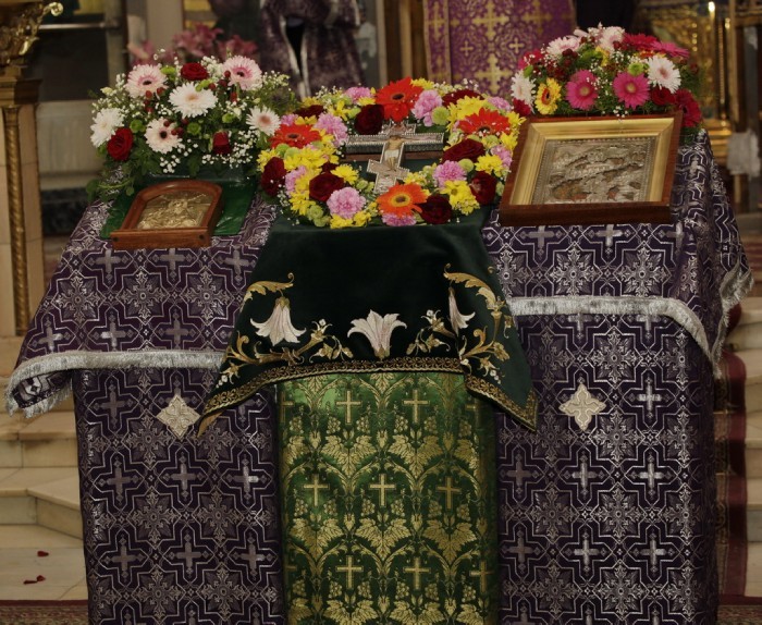 Накануне было совершено Всенощное бдение, за которым после Великого славословия из алтаря для поклонения верующими был вынесен Крест Господень, в который вложены частица животворящего древа Креста Господня, а также частицы мощей 24 угодников Божиих.