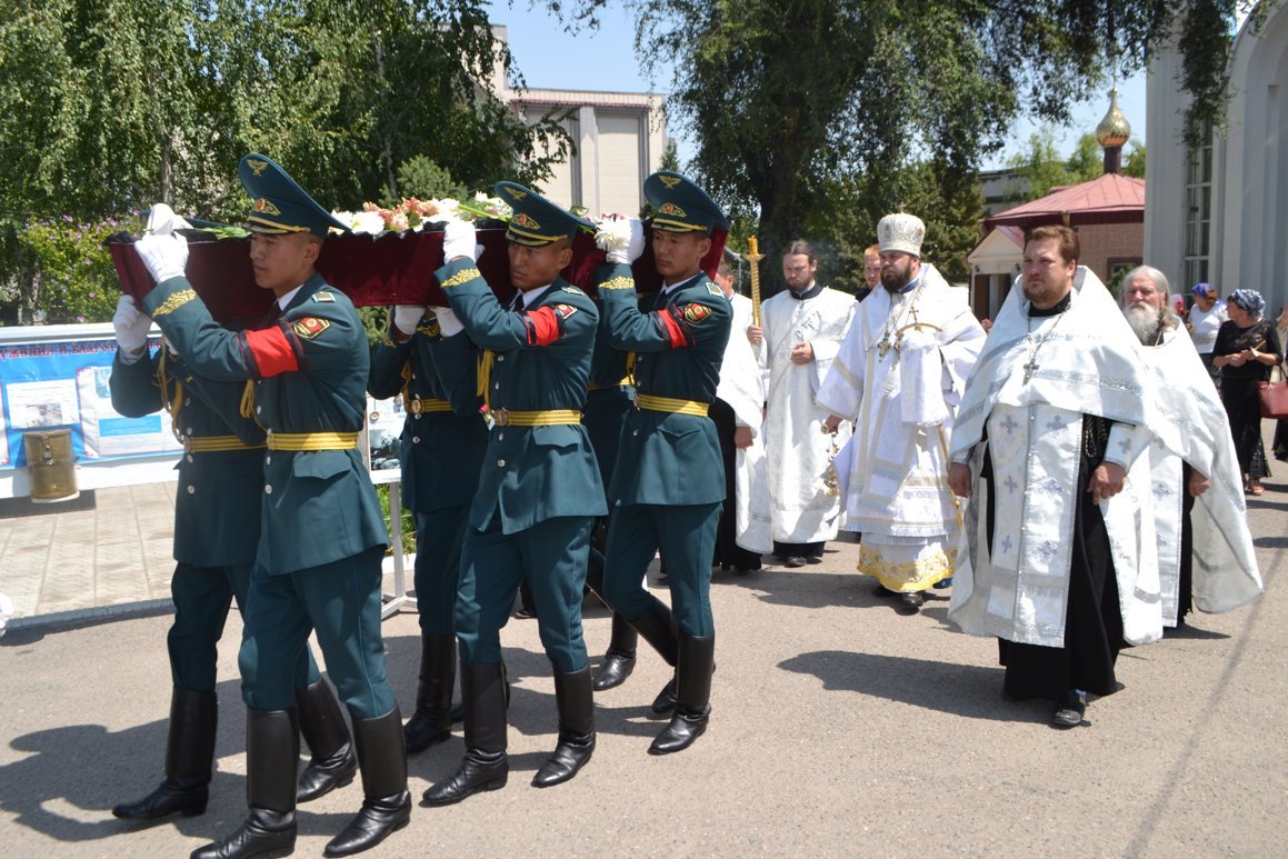 Чин отпевания был совершен в Алексеевском приделе Свято-Воскресенского кафедрального собора. В храме, на отпевании присутствовали представители Генерального штаба Вооруженных Сил Кыргызской Республики. Траурная церемония проходила в сопровождении военного духового оркестра.