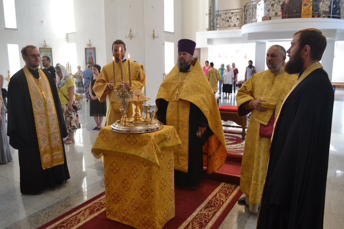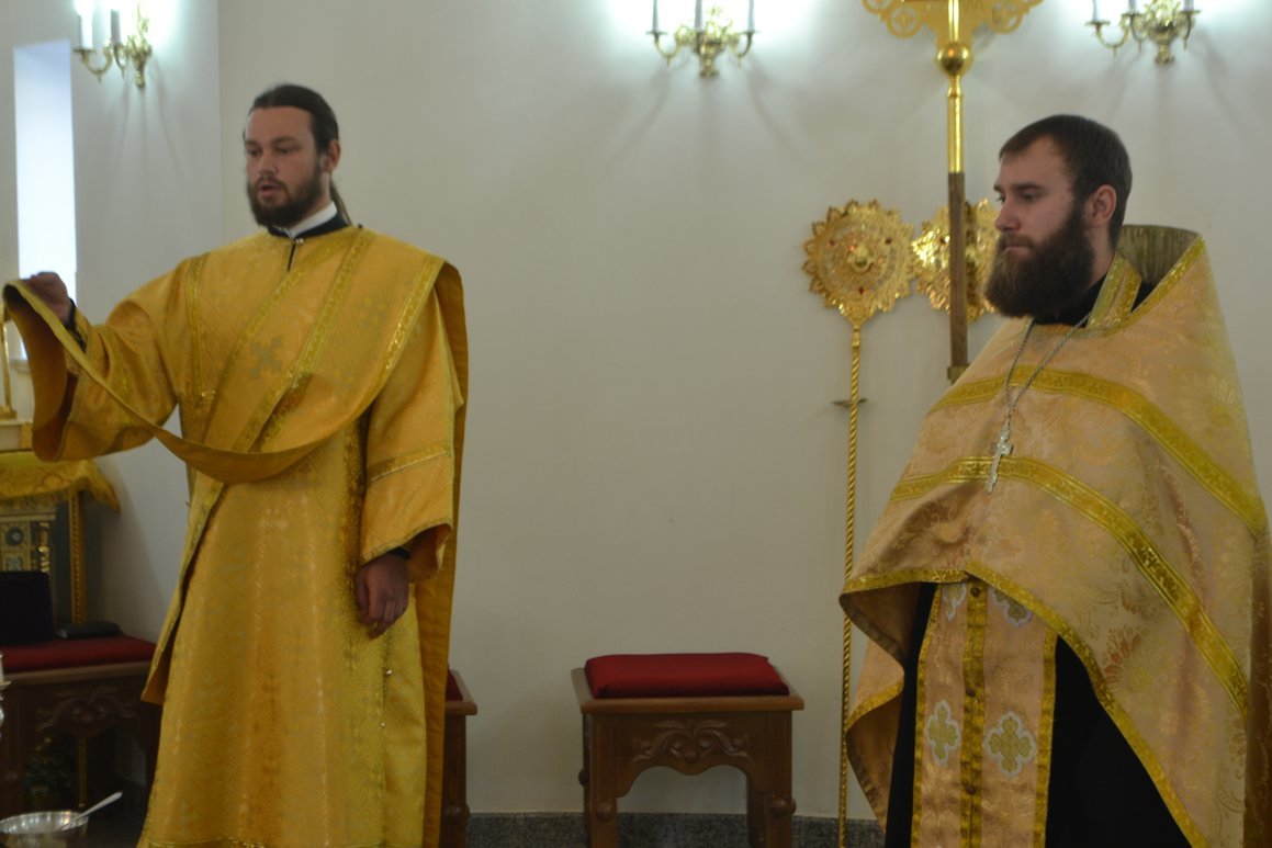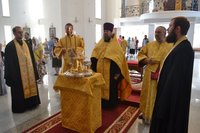Его Преосвященству сослужили: настоятель Владимирского собора протоиерей Алексей Зайцев, клирики Владимирского собора иерей Алексей Сыромятников, иерей Николай Головченко, иерей Никита Чебуков, клирик Свято-Воскресенского собора иерей Георгий Дворовой.