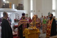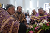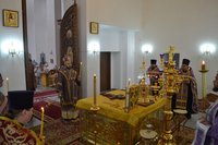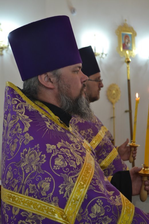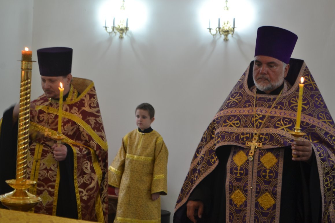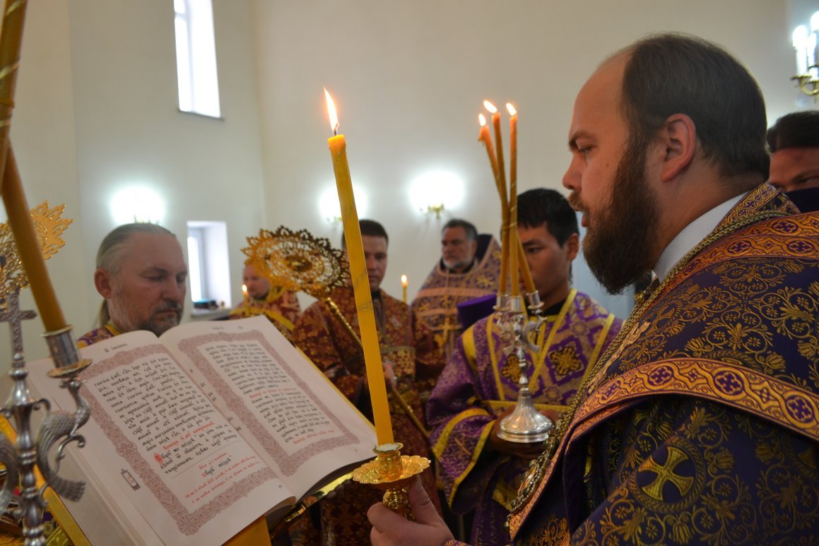 Его Преосвященству сослужили: настоятель Владимирского собора протоиерей Алексей Зайцев, клирик Свято-Воскресенского собора иерей Георгий Дворовой, клирики Владимирского собора иерей Алексей Сыромятников, иерей Николай Головченко, иерей Никита Чебуков.