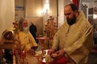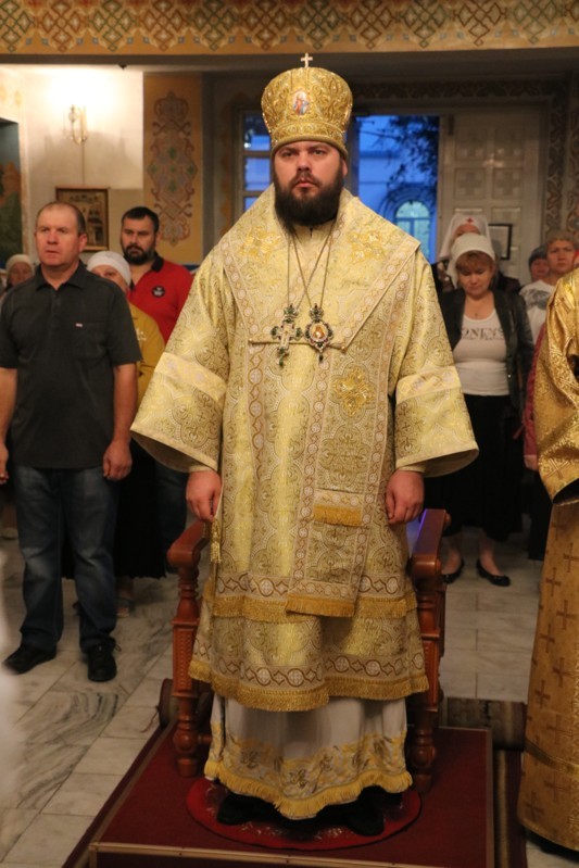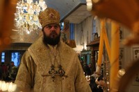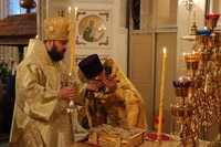 Его Преосвященству сослужили: митрофорный протоиерей Валентин Никонов, клирик Свято-Воскресенского собора иерей Георгий Дворовой.