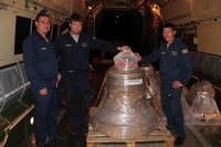 "Вопрос доставки колоколов был оперативно решен при поддержке и активном участии Генштаба и Национального центра управления обороной РФ. Уже через несколько дней после окончания работ колокола перевезли на аэродром Чкаловск, откуда через Кольцово (Свердловская область) доставили военно-транспортным самолетом в Кант", - рассказал помощник командира авиабазы по работе с верующими военнослужащими иерей Евгений Циклаури.