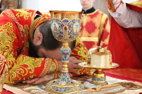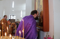 «Мы сегодня преклоняем свое сердце, свои колени пред Крестом Господним. По церковным правилам земные поклоны после Причастия не делаются, но три раза в году мы выходим после Причастия в конце литургии и совершаем поклонение Кресту Господню. Крест – это оружие победы над адом, над смертью, над грехом. Это оружие которое явило нам спасение. Это Древо, которое явило нам оправдание, ведь древо Адамово, от которого он вкусил плод запретный, стало для всего человечества древом смерти. Крест же Господень явился Древом жизни нашей. Надеемся и веруем, что Господь хранит нас Крестом Своим Животворящим. Животворит нас благодать Святого Духа, исходящая от особой святыни Креста Господня, потому что сам Господь находясь некогда на Кресте предал Свой Дух и Свою Жизнь ради нас. Не было бы Креста, не было бы и славного Воскресения. Поэтому «Кресту Твоему поклоняемся Владыка и святое Воскресение Твое славим» поет сегодня вся полнота Православия и прославляет Крест Господень вместе в Воскресением Его».