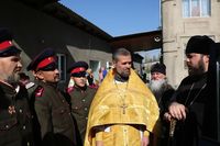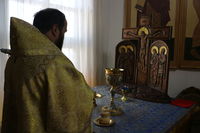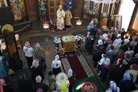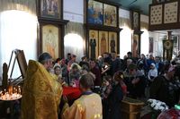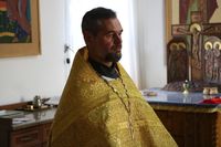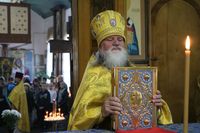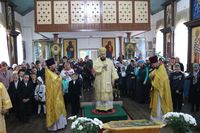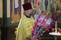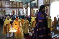 Его Преосвященству сослужили: митрофорный протоиерей Валентин Никонов, настоятель храма протоиерей Василий Пименов, клирик Свято-Воскресенского собора иерей Георгий Дворовой.