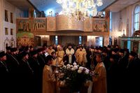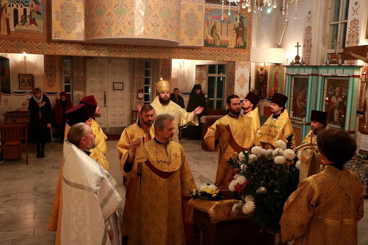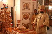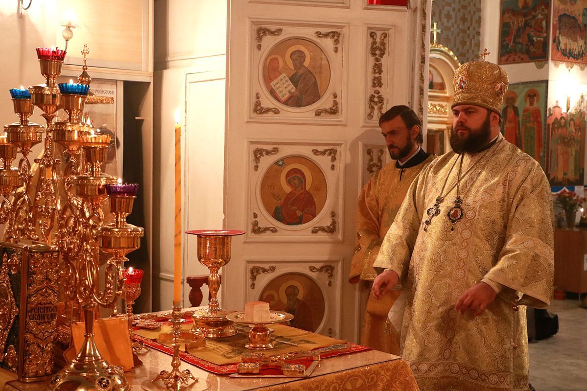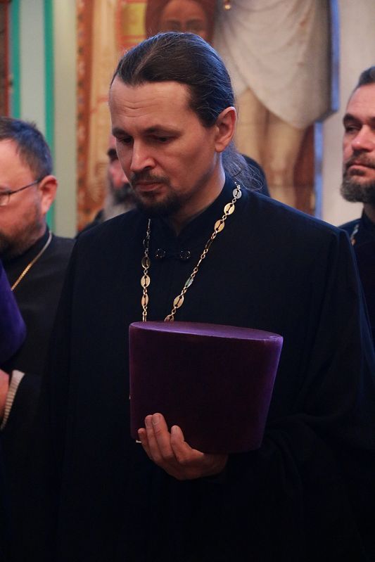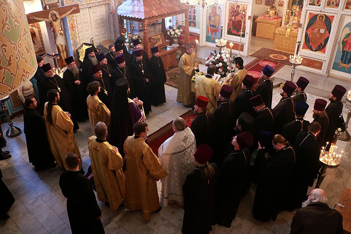 Его Преосвященству сослужили: благочинный Ошского округа протоиерей Виктор Реймген, благочинный Иссык-Кульского округа протоиерей Сергий Чувичкин, ключарь Свято-Воскресенского собора иерей Георгий Дворовой, благочинный Бишкекского округа протоиерей Андрей Кунавин, настоятель храма во имя святого праведного Иоанна Кронштадтского протоиерей Андрей Борисенко, клирики Свято-Воскресенского собора иерей Олег Белотуркин, иерей Вадим Паскин.