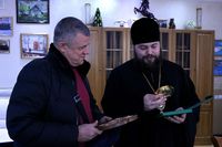 Его Преосвященство вручил Александру Леонидовичу памятные подарки, переданные Святейшим Патриархом Московским и всея Руси Кириллом, в честь 70-летнего юбилея Предстоятеля Русской Православной Церкви: книгу "Слово Патриарха", настенное инкрустированное Распятие и медаль с изображением Святейшего Патрираха, приуроченная к его юбилею. Обращаясь с поздравлением к г-ну Гайдукову, епископ Даниил отметил, что памятные Патриаршие подарки вручены главному благотворителю храма, в благодарность «за понесенные труды в благородном деле храмостроительства, в память о нашем Московском Святителе и, конечно же, как Патриаршее благословение».