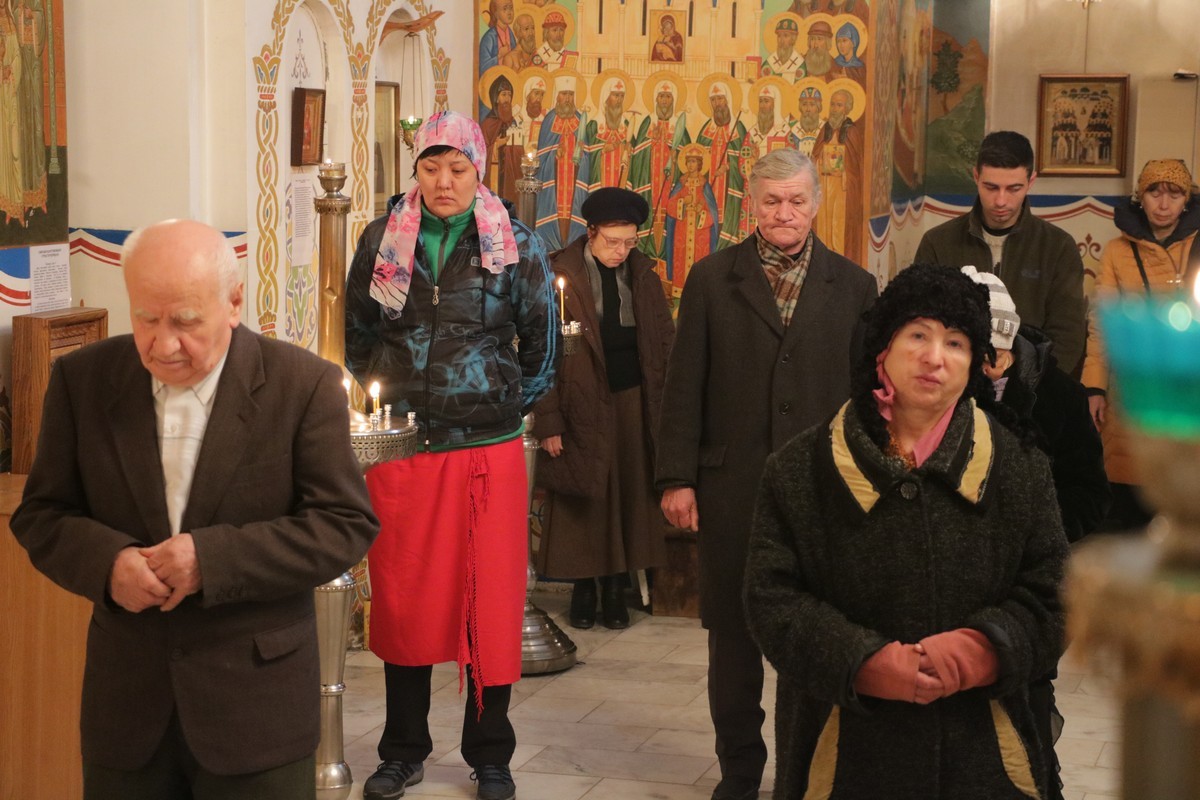 Его Преосвященству сослужили: ключарь Свято-Воскресенского собора иерей Георгий Дворовой, благочинный Бишкекского округа протоиерей Андрей Кунавин.