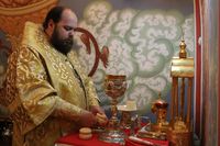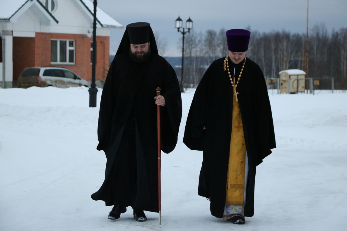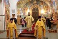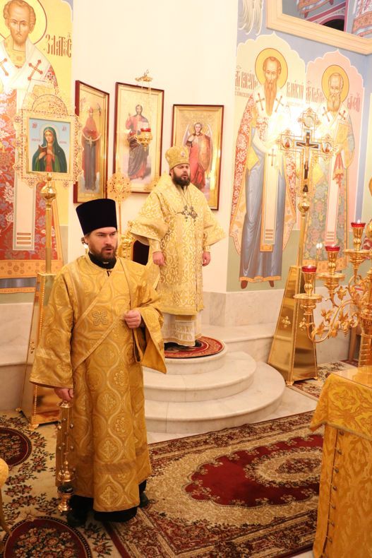 Его Преосвященству сослужили: протоиерей Игорь Князев настоятель храма Спаса Нерукотворного г. Кондово, протоиерей Алексей Пелевин настоятель храма Рождества Пресвятой Богородицы, иерей Александр Земцов настоятель храма великомученика Георгия Победоносца с. Романово, иерей Александр Пелин секретарь Епархиального управления Бишкекской и Кыргызстанской епархии.