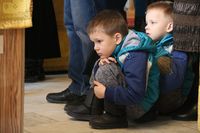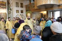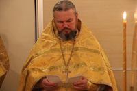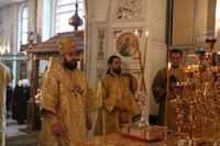 Его Преосвященству сослужили: митрофорный протоиерей Валентин Никонов, ключарь Свято-Воскресенского собора иерей Георгий Дворовой, клирик собора иерей Вадим Паскин.