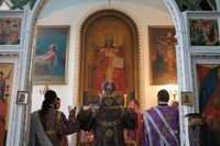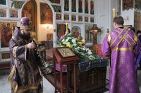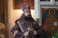 Его Преосвященству сослужили: митрофорный протоиерей Валентин Никонов, ключарь Свято-Воскресенского собора иерей Георгий Дворовой, клирик собора иерей Сергий Чудайкин.
