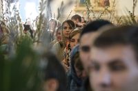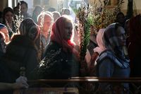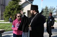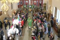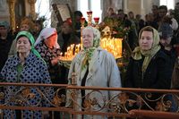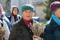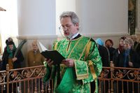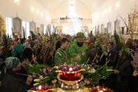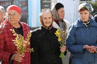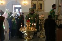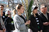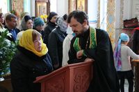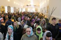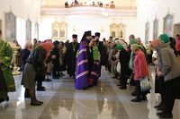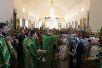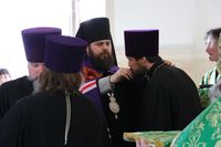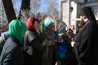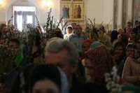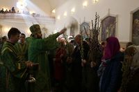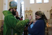Его Преосвященству сослужили: митрофорный протоиерей Валентин Никонов, ключарь собора иерей Георгий Дворовой, благочинный Бишкекского округа протоиерей Андрей Кунавин, клирики иерей Олег Белотуркин, иерей Вадим Паскин. За богослужением епископ Даниил помазал прихожан освященным елеем и совершил освещение ваий.