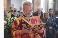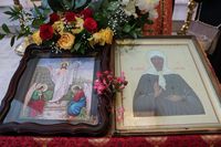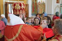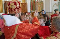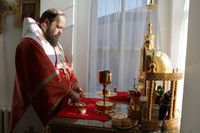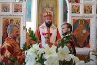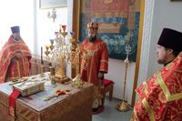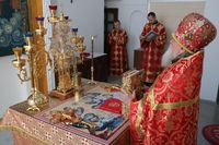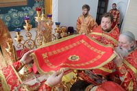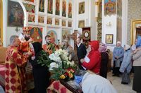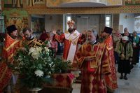 По окончании причащения Его Преосвященство с сослужащим духовенством совершил чин славления и прочёл молитвы святой блаженной матери Матроне Московской и святителю Виктору, исповеднику, епископу Глазовскому.