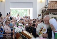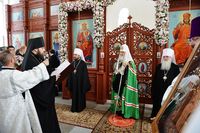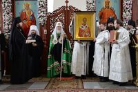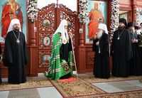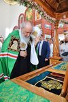 По прибытии в собор Святейший Патриарх Кирилл поклонился честным мощам преподобноисповедника Ираклия Иссык-Кульского.