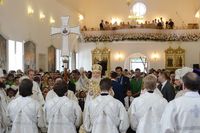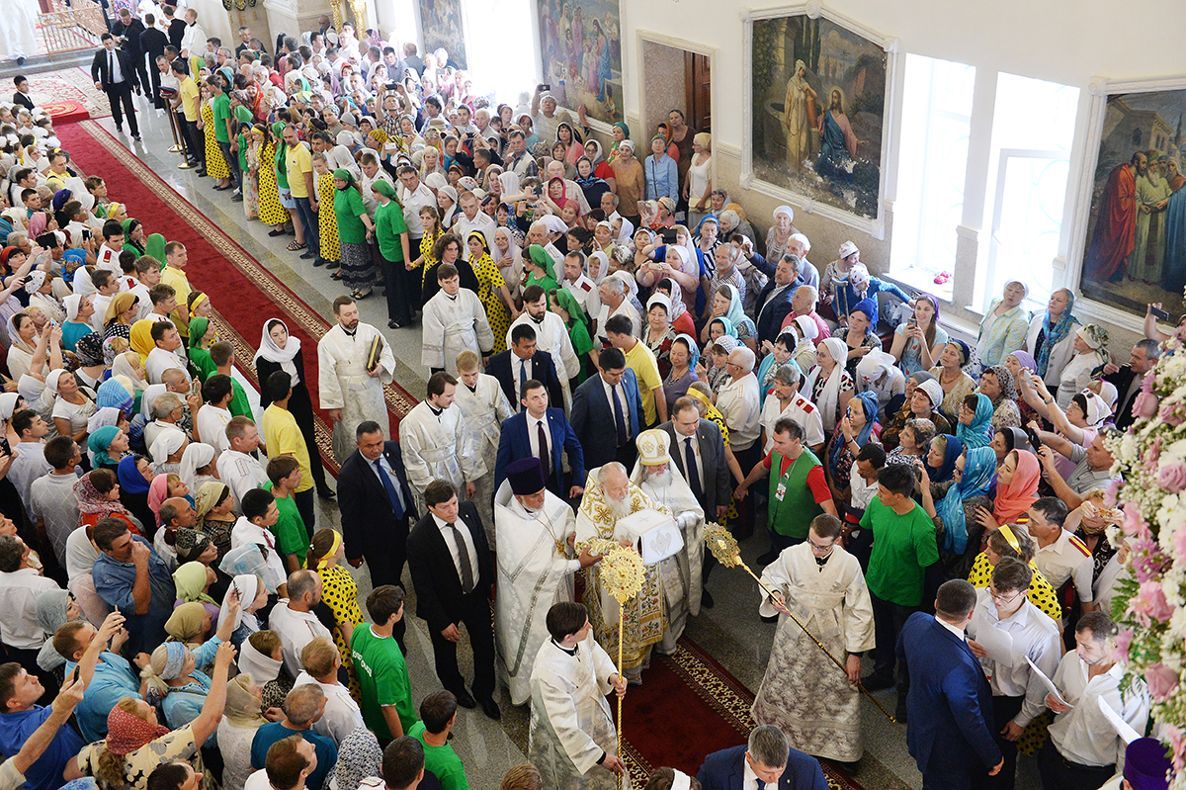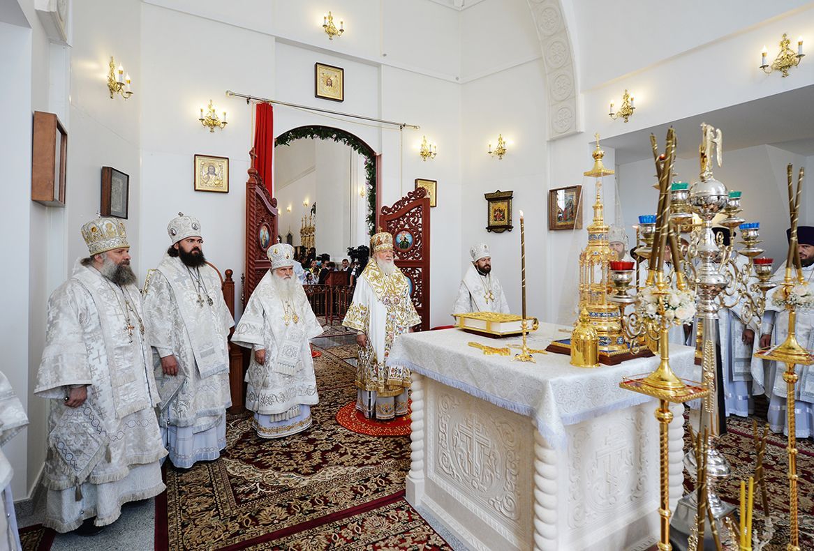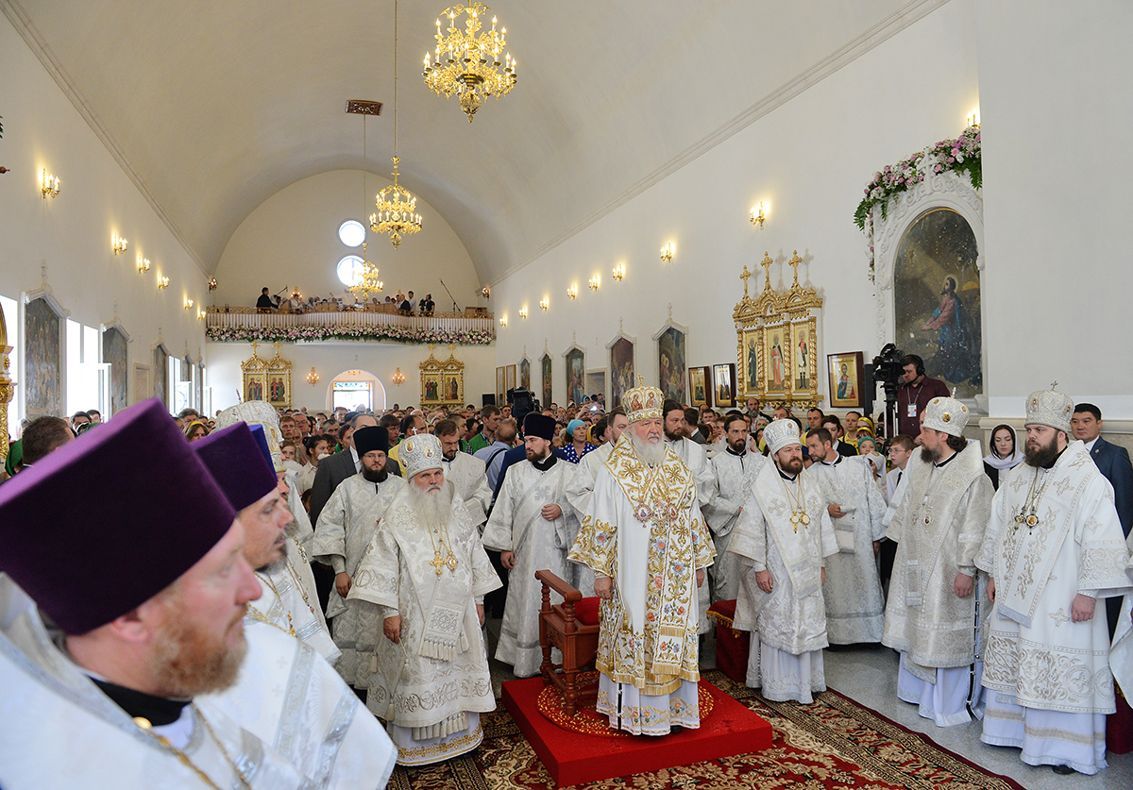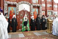 За Литургией Его Святейшеству сослужили: митрополит Ташкентский и Узбекистанский Викентий, глава Среднеазиатского митрополичьего округа; митрополит Волоколамский Иларион, председатель Отдела внешних церковных связей Московского Патриархата; архиепископ Пятигорский и Черкесский Феофилакт, временный управляющий Патриаршим благочинием приходов Русской Православной Церкви в Туркменистане; архиепископ Солнечногорский Сергий, руководитель Административного секретариата Московской Патриархии; епископ Душанбинский и Таджикистанский Питирим; епископ Бишкекский и Кыргызстанский Даниил; протоиерей Валентин Никонов, духовник Бишкекской епархии, клирик Воскресенского кафедрального собора г. Бишкека; протоиерей Алексий Зайцев, клирик собора святого равноапостольного великого князя Владимира г. Бишкека; священник Димитрий Сафонов, секретарь ОВЦС по межрелигиозным отношениям; протоиерей Андрей Марущак, клирик кафедрального соборного Храма Христа Спасителя г. Москвы; духовенство Бишкекской епархии.