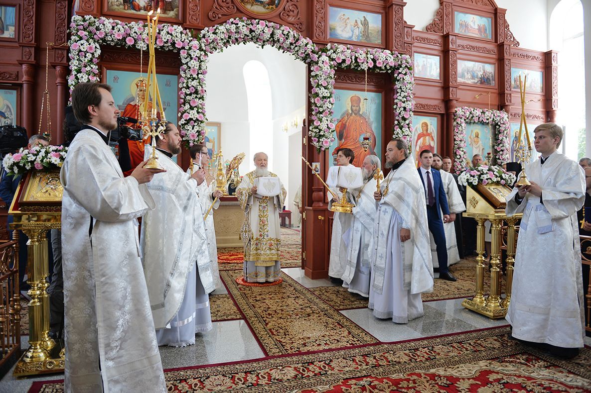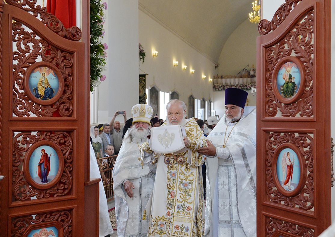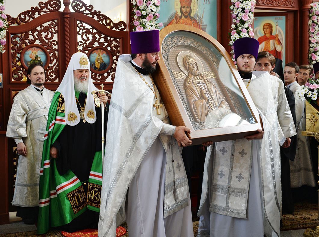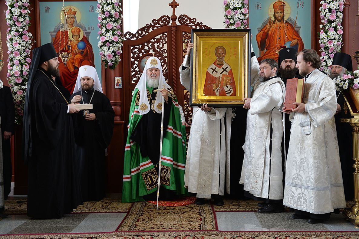 В дар новоосвященному собору Святейший Владыка передал икону святителя и чудотворца Николая, архиепископа Мир Ликийских, часть мощей которого принесена ныне из итальянского города Бари в Россию.