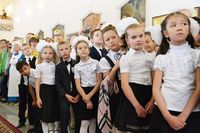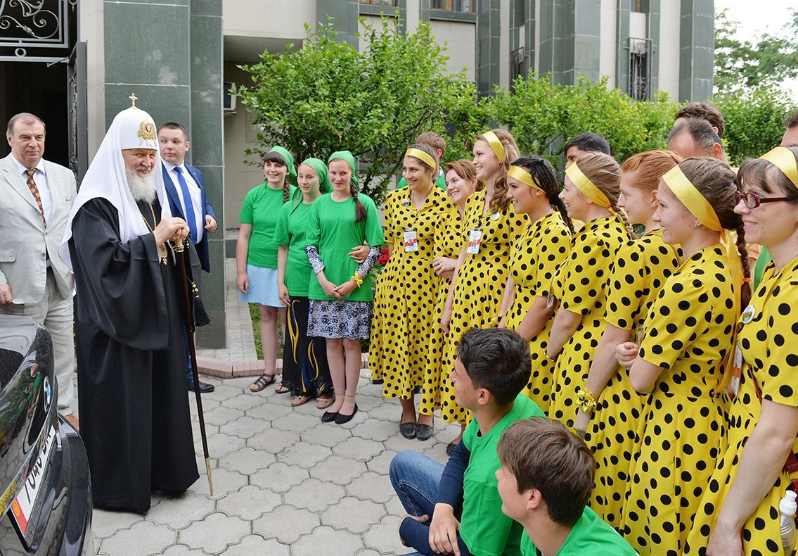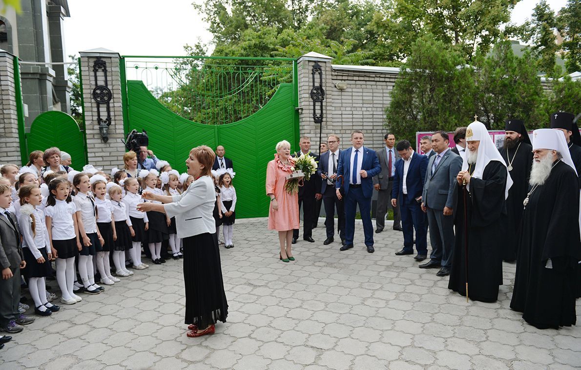 Затем на территории собора состоялась беседа Святейшего Патриарха Кирилла с директором Свято-Владимирской школы С.И. Аристовой и учащимися школы.