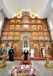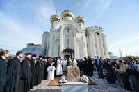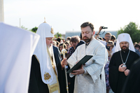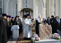 После осмотра храма Предстоятель Русской Православной Церкви совершил чин освящения закладного камня в основание нового здания школы святого равноапостольного князя Владимира.