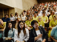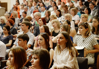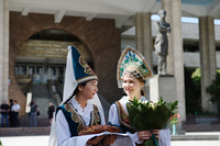 Святейший Патриарх Кирилл и встречавшие перешли в Большой актовый зал университета, где собрались профессорско-преподавательский состав, студенты и гости Кыргызско-Российского Славянского университета.