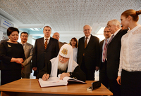 В завершение визита в университет Святейший Патриарх Кирилл оставил запись в книге почетных гостей КРСУ: «С большой благодарностью к университету за оказанную честь с пожеланием помощи Божией в большом творческом делании всем педагогам и студентам. Патриарх Кирилл».