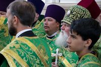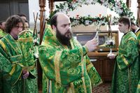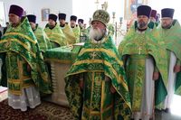 Его Преосвященству сослужили: протоиерей Валентин Никонов, благочинный Беловодского округа, настоятель храма Сошествия Святого Духа протоиерей Алексей Махров, ключарь Свято-Воскресенского кафедрального собора иерей Георгий Дворовой, настоятель Владимирского собора протоиерей Алексий Зайцев, благочинный Чуй-Токмокского округа, настоятель храма Георгия Победоносца протоиерей Александр Атаманов, настоятель храма блгв. кнн. Бориса и Глеба протоиерей Артемий Долотов, настоятель храма Божией Матери в честь Ее иконы «Всех скорбящих радость» протоиерей Василий Пименов, секретарь епархиального управления, настоятель храма Архистратига Божия Михаила иерей Александр Пелин, настоятель храма Покрова Божией Матери иерей Виктор Гончарук, клирики собора иерей Олег Белотуркин, иерей Вадим Паскин, протодиакон Сергий Черкашин.