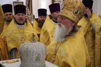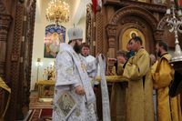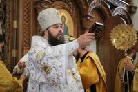 По завершении архипастырского обращения слово взял настоятель Владимирского собора протоиерей Алексий Зайцев, в котором он поздравил Его Преосвященство с праздником и сердечно поблагодарил за совершение Божественной литургии.