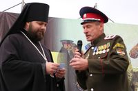 По завершении архипастырского слова, на сцену поднялся войсковой атаман Союза казаков Семиречья Александр Зуев. Поблагодарив владыку Даниила за приложенные труды и вклад во имя объединения казачьих организаций Кыргызстана, он наградил Его Преосвящество высокой казачьей наградой – Крестом «Атамана Платова».