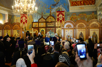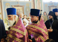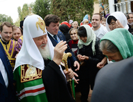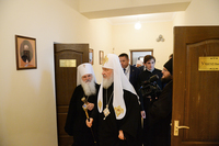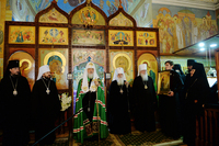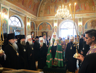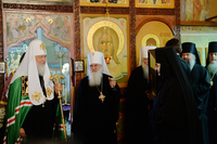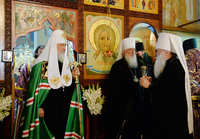 В храме святителя Николая Святейшего Патриарха приветствовал митрополит Викентий, который преподнес Его Святейшеству панагию с изображением Святой Троицы.