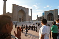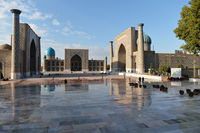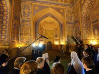 Из мечети Биби Ханум Святейший Патриарх Кирилл переехал на Площадь Регистан, где посетил медресе Тилля-Кари (в переводе с узбекского ― «позолоченное медресе») ― духовно-просветительское и образовательное сооружение XVII века.