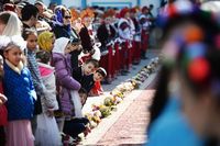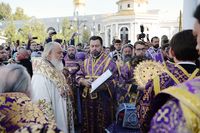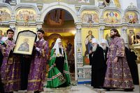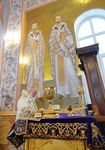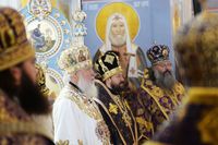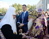 По окончании Литургии митрополит Ташкентский и Узбекистанский Викентий от лица духовенства и верующих приветствовал Святейшего Владыку и преподнес Его Святейшеству образ святого равноапостольного князя Владимира.