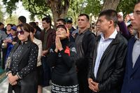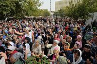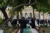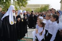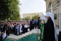 Затем Предстоятель, архиереи и духовенство вышли на паперть храма. Глава Среднеазиатского митрополичьего округа митрополит Ташкентский и Узбекистанский Викентий приветствовал Святейшего Владыку.