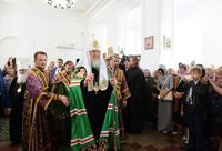В дар храму Святейший Патриарх передал икону Божией Матери «Спорительница хлебов». Верующим были вручены иконки Спаса Нерукотворного.