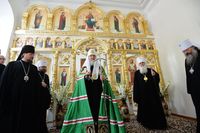 Предстоятеля Русской Православной Церкви сопровождали глава Среднеазиатского митрополичьего округа митрополит Ташкентский и Узбекистанский Викентий, председатель Отдела внешних церковных связей митрополит Волоколамский Иларион, митрополит Екатеринбургский и Верхотурский Кирилл, руководитель Административного секретариата Московской Патриархии архиепископ Солнечногорский Сергий, председатель Синодального отдела по взаимоотношениям Церкви с обществом и СМИ В.Р. Легойда, руководитель Пресс-службы Патриарха Московского и всея Руси священник Александр Волков.