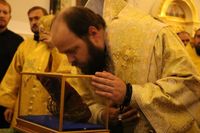 В этот вечер прихожане, прибывшие встречать святыню, получили возможность приложиться к бархатному башмачку. После того, как все приложились, башмачок положили в специально приготовленный ковчежец. Теперь святыня будет храниться в соборе, и по особым торжествам ее будут выносить для поклонения.
