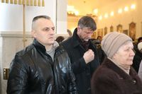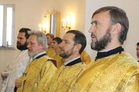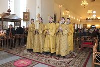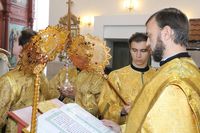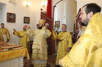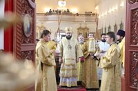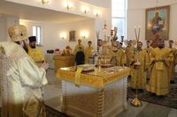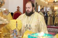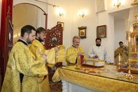 Его Преосвященству сослужили: протоиерей Валентин Никонов, ключарь Свято-Воскресенского кафедрального собора, благочинный Бишкекского округа протоиерей Андрей Кунавин, клирик собора иерей Георгий Дворовой.