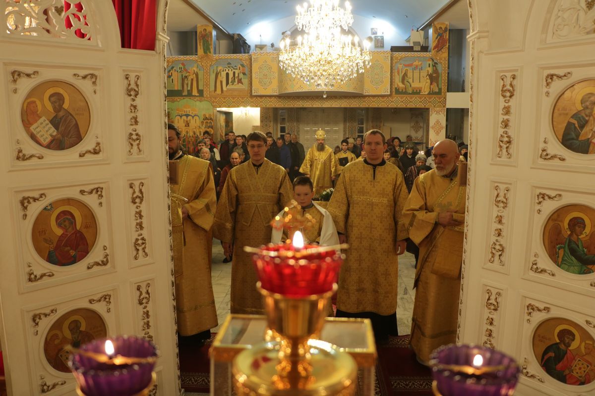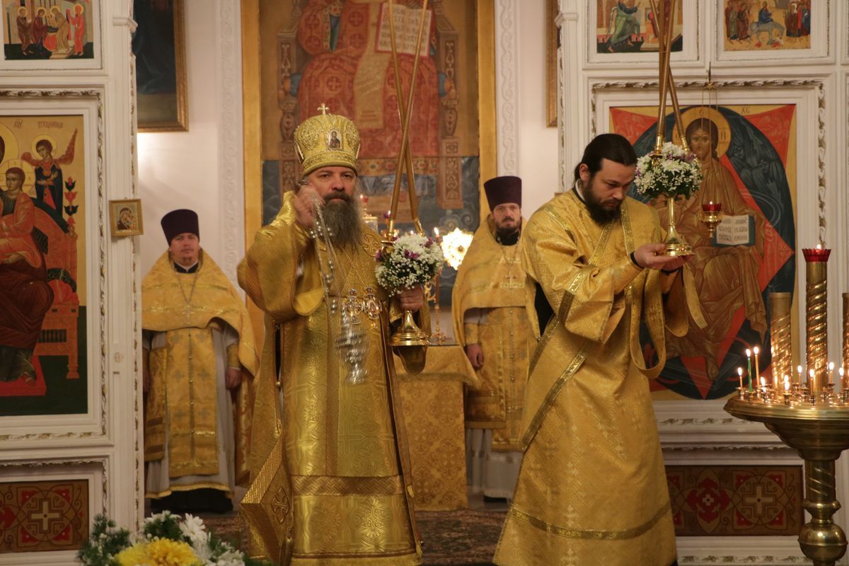 Его Преосвященству сослужили: ключарь Свято-Воскресенского кафедрального собора протоиерей Андрей Кунавин, секретарь епархиального управления, настоятель храма Архистратига Божия Михаила иерей Александр Пелин.