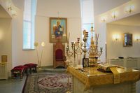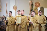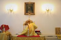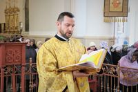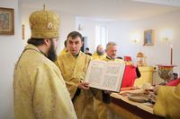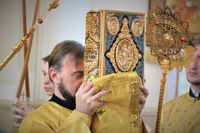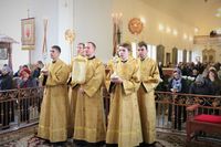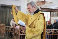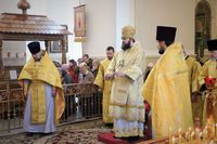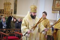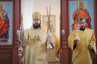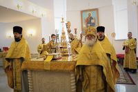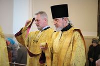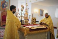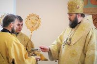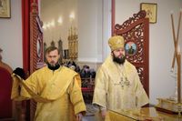 Его Преосвяществу сослужили: протоиерей Валентин Никонов, ключарь Свято-Воскресенского кафедрального собора протоиерей Андрей Кунавин, иерей Георгий Дворовой.