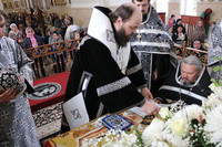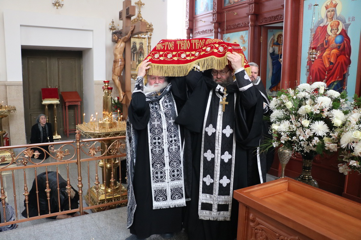 В конце вечерни Великой пятницы был совершен обряд выноса Плащаницы Христовой с изображением положения Его во гроб и прочитан канон о распятии Господа и на плач Пресвятой Богородицы. После отпуста вечернего богослужения прихожане приложились к Плащанице.