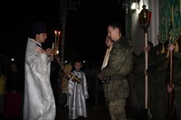 В ночь с 7 по 8 апреля, на территории 999 авиационной базы ОДКБ «Кант» в Храме Александра Невского, во главе с настоятелем храма иереем Евгением Циклаури, прошла торжественная служба в честь светлого Христово Воскресения Пасхи.
