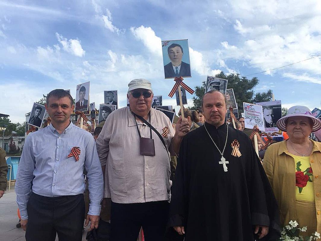 Под руководством настоятеля храма – иерея Сергия Арбузова прихожане храма направились к зданию местной мэрии, где все стали участниками общей колонны и вместе с мэром города возложили цветы у вечного огня к памятнику Родина Мать.