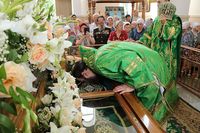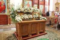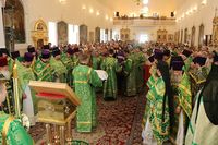 За торжественным богослужением был совершен молебен преподобному Ираклию. В этот день, во время Божественной литургии рака с мощами небесного покровителя земли Кыргызстанской для сугубого поклонения была установлена в центре собора.