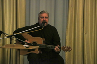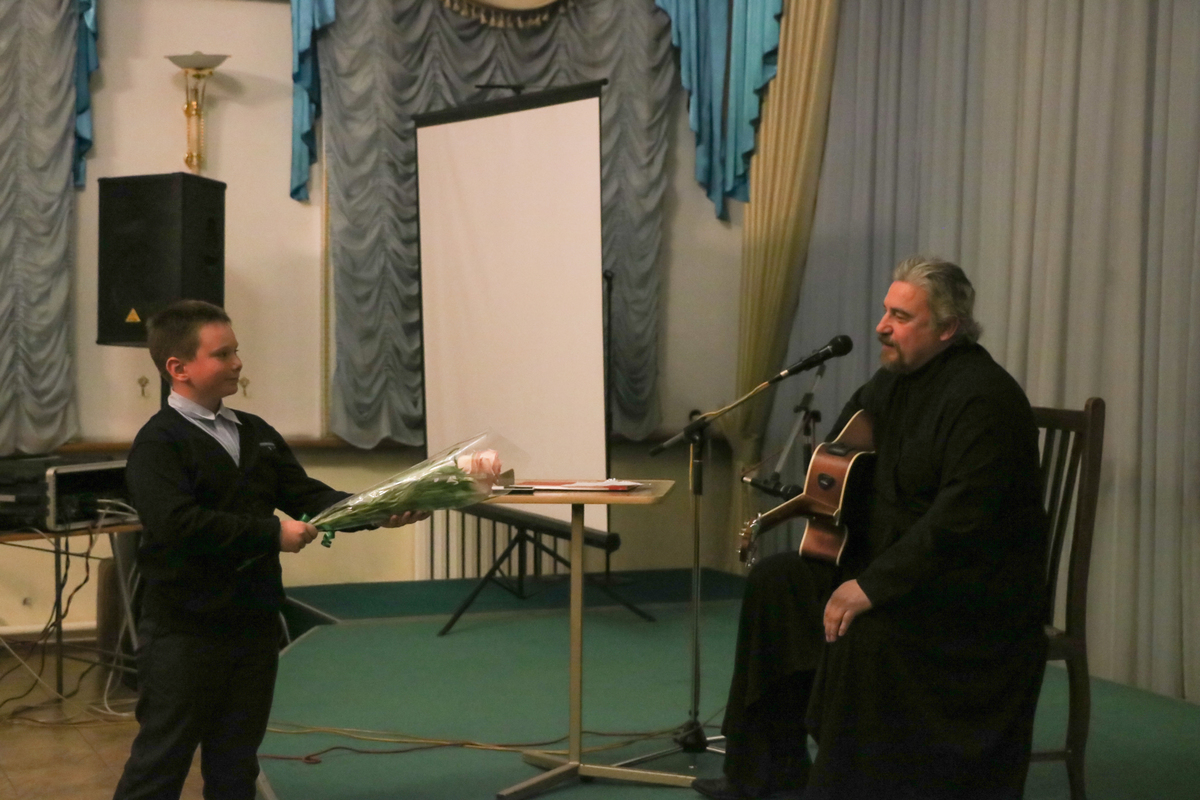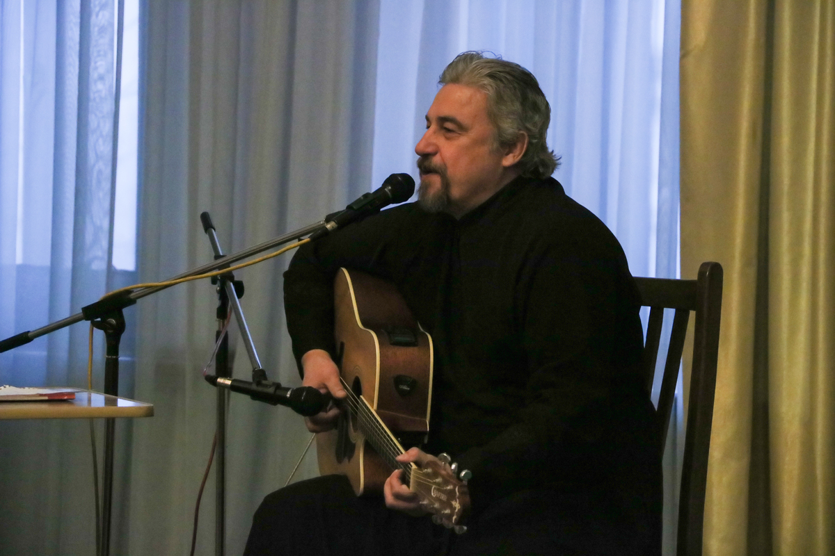 Творческий вечер состоял из двух частей. Первую часть своего выступления бард посвятил личному творчеству. Аккомпанируя под гитару, он исполнил песни собственного сочинения, мотивами которых, по его словам, послужили эпизоды из Евангелия, притч, житий святых и, конечно же, собственного опыта.
