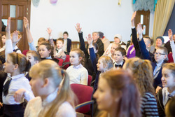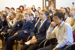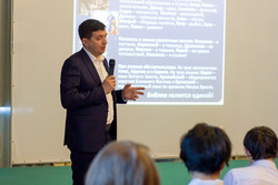 Роман Федянин представил аудитории презентацию об истории создании Библии и её переводах, а также провел викторину для школьников. По итогу многие ребята получили в награду за правильные ответы в викторине шоколадки и другие памятные призы.