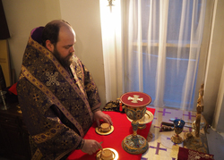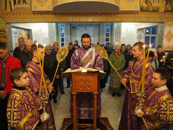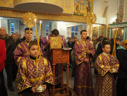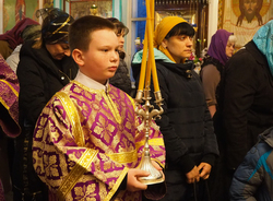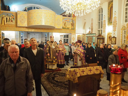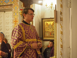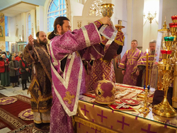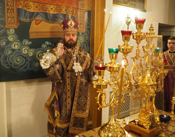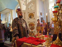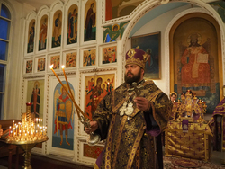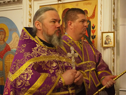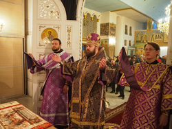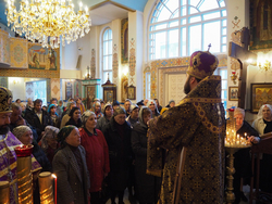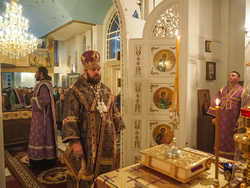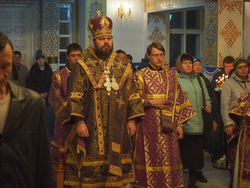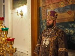 Его Преосвященству сослужили: ключарь Свято-Воскресенского кафедрального собора архимандрит Пётр (Путиёв), иерей Георгий Дворовой.