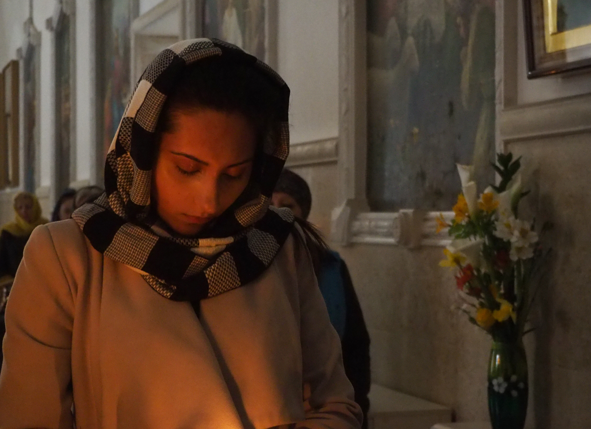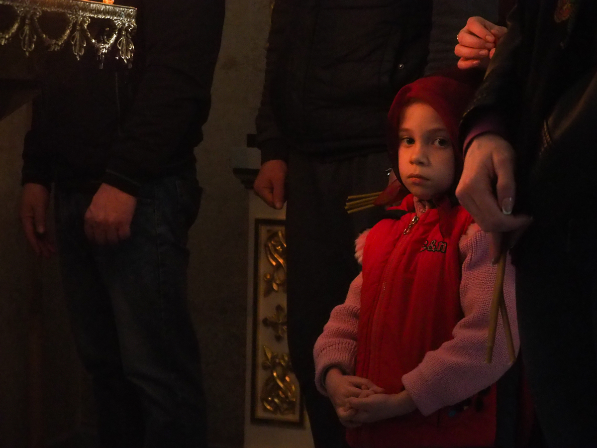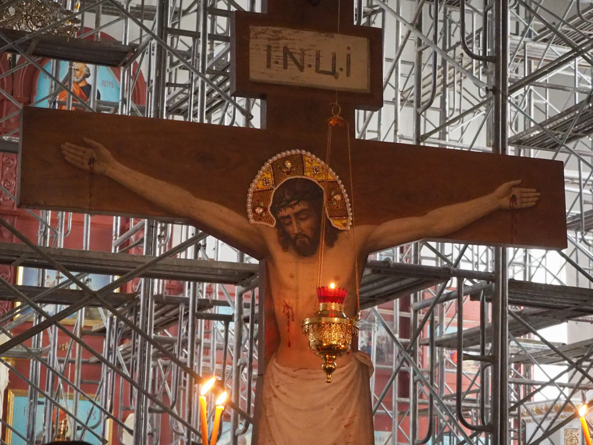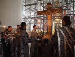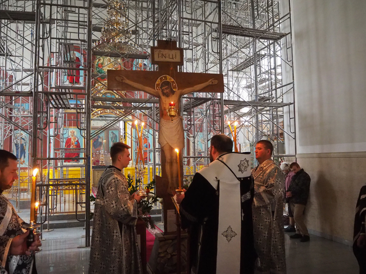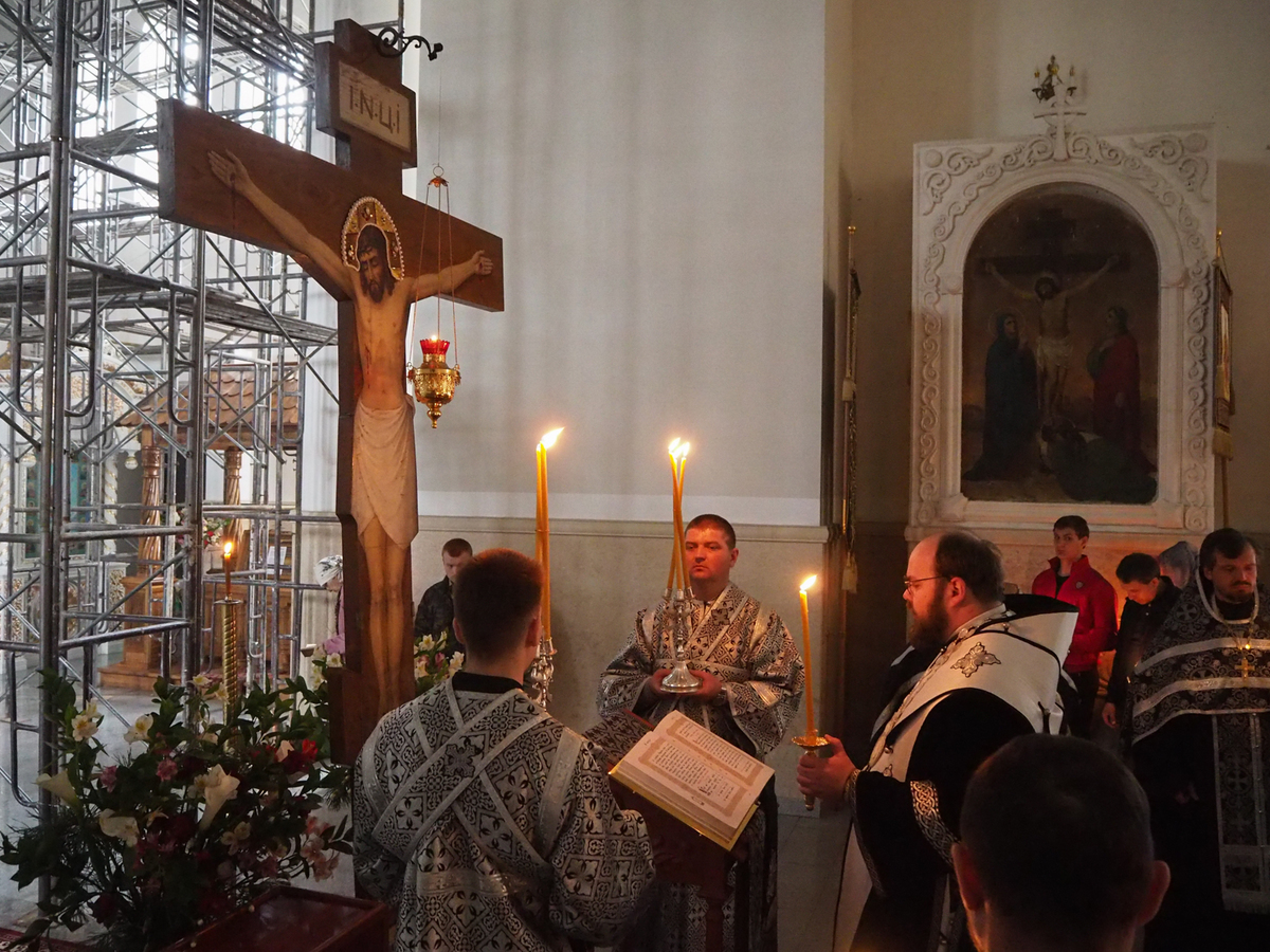 В конце службы все верующие с благоговением подошли поклониться перед Распятием, Крестом Христовым, который на Пассии выносится на середину храма.