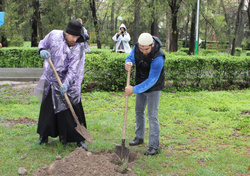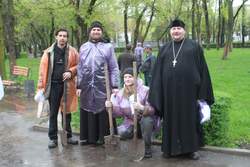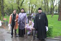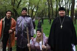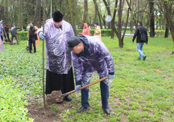 Не смотря на сильнейший ливень, разыгравшийся в прошедшую субботу – 6 апреля, около 40 представителей различных конфессий собрались на межконфессиональный субботник в сквере имени Тоголока Молдо, что на пересечении улиц Московская и Коенкозова в городе Бишкек. Организатором субботника выступила Государственная комиссия по делам религии при Президенте Кыргызской Республики при содействии программного офиса Организации по безопасности и сотрудничеству в Европе (ОБСЕ) в Бишкеке и представительства Института по освещению войны и мира (IWPR). Основной целью субботника, помимо озеленения и уборки городского сквера, было укрепление сотрудничества между представителями различных конфессий страны: Мусульмане, Православные христиане, Католики и протестанты. От Бишкекской и Кыргызстанской епархии в субботнике приняли участие помощник секретаря епархии по связям с общественностью протоиерей Алексей Сыромятников, руководитель Отдела по делам молодежи иерей Илия Меляков и добровольцы из молодежного движения Кыргызстана.